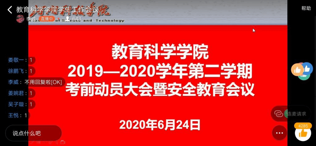 为帮助学生应对疫情期间考试形式的变化,严守考试纪律,端正考试心态,做好考前准备,同时增强疫情期间学生居家安全防范意识。6月24日下午,绅士漫画 通过钉钉平台召开2019-2020学年第二学期考前动员大会暨安全教育会议。学院全体辅导员及17、18、19级全体学生参加会议。