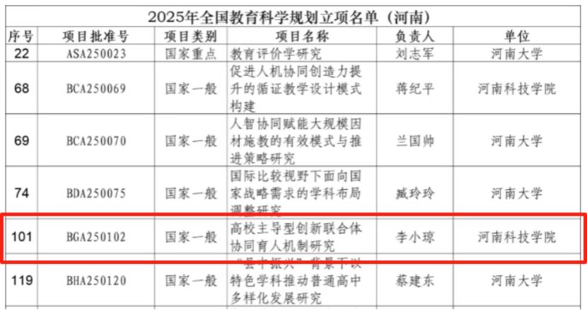 8月19日,全国教育科学规划领导小组办公室发布了2025年全国教育科学规划立项名单,李小琼博士主持的《高校主导型创新联合体协同育人机制研究》获批全国教育科学规划国家一般项目,资助经费20万元。