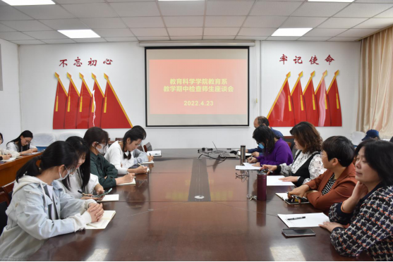 于零号楼十楼会议室召开2021-2022学年第二学期教育学专业教学期中检查师生座谈会。教学秘书郭庆霞、教育系主任李红义、教研室主任杨红旻、马燕、于洪姣,及学生代表参加会议。