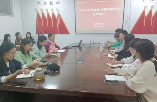 于零号楼十楼会议室召开2023-2024学年第一学期教育学专业期中教学检查师生座谈会。副院长王晶、教育学专业负责人杨红旻、教研室主任于洪姣、任课教师代表李运萍、王佳佳、邓金春、王凤及学生代表参加会议,会议由杨红旻主持。