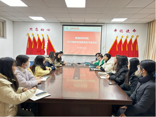 2023级研究生教育见习动员会在0号楼1008会议室召开,教育管理领域和学前教育领域的14名研究生全部参会,同时参会的还有研究生秘书助理张馨元老师,会议由副院长高佳主持。