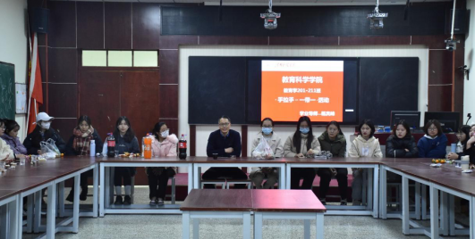 学业导师杨宾峰在教学技能实训室开展“手拉手 一带一”学业指导活动,其指导的教育学专业2020级和2021级学生参加了活动。