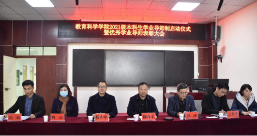 在老图书馆四楼教学技能训练室隆重举行2021级本科生学业导师制启动仪式暨优秀导师表彰大会。按照疫情防控要求,采取线上线下相结合的方式进行。副校长陈合义、学院党政领导出席本次会议,与会人员还有学业导师代表、2021级学生代表及线上参会的2021级全体学生。会议由院党委书记张涛主持。