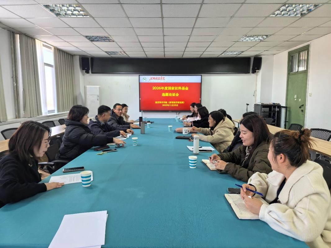 在0#906会议室举办2026年度国家社科基金申报选题论证会。本次会议特别邀请陈锋正博士担任点评专家,学院领导班子成员及申报教师参加会议。会议由副院长刘秋云主持。