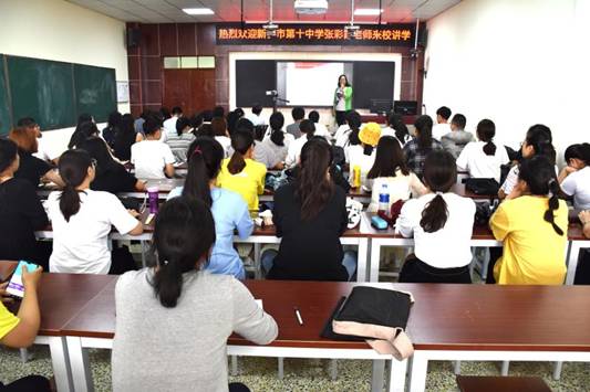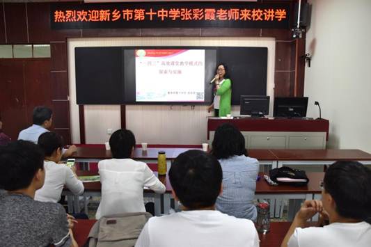 报告中,张老师结合教学案例向大家介绍了新乡市十中在教学实践中总结的“一四三”高效课程教学模式,即:一个中心,四个环节,三种学习。一个中心即课堂教学以学生展示为中心。四个环节是教学过程中设计的创设情境、确定目标,任务分解、小组准备,开放展示、互动生成,小结反馈、矫正提升四个相互链接的教学步骤。三种学习主要指学案引导自主学、任务分解合作学、主题拓展探究学。张老师的报告幽默风趣,资料翔实,向大家展示了新乡市十中在教学实践改革方面的成果,使大家受益匪浅。