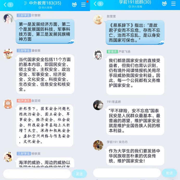 组织全体学生参与国家安全知识竞赛,同学们积极了解相关知识,认真答题,并利用微博平台发起“全民国家安全教育日”“国家安全在我身边”等话题讨论。家是最小国,国是千万家。“国泰”方能“民安”,在维护国家安全上,人人都不是局外人、旁观者,而是人人有责,更需人人尽责。