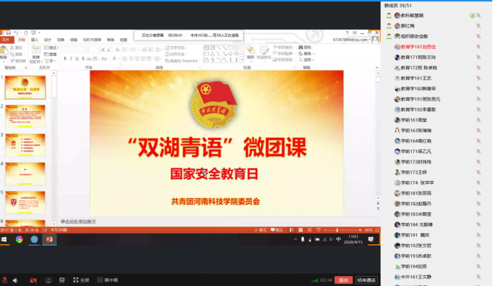 开展 “国家安全教育日”线上主题微团课活动。此次团课由院团委书记熊慧娟主讲,各团支部书记30余人参加学习。熊慧娟围绕“何为国家安全”“当前国际国内形势”“危害国家安全的行为及相关罪名”等方面进行讲解。并针对“如何维护国家安全”“谁来保卫国家安全”等问题进行详细解读,希望各团支部书记认真学习国家安全教育相关知识,不断提高自身综合素质,为维护国家安全贡献自己的力量,做一名合格的当代大学生。