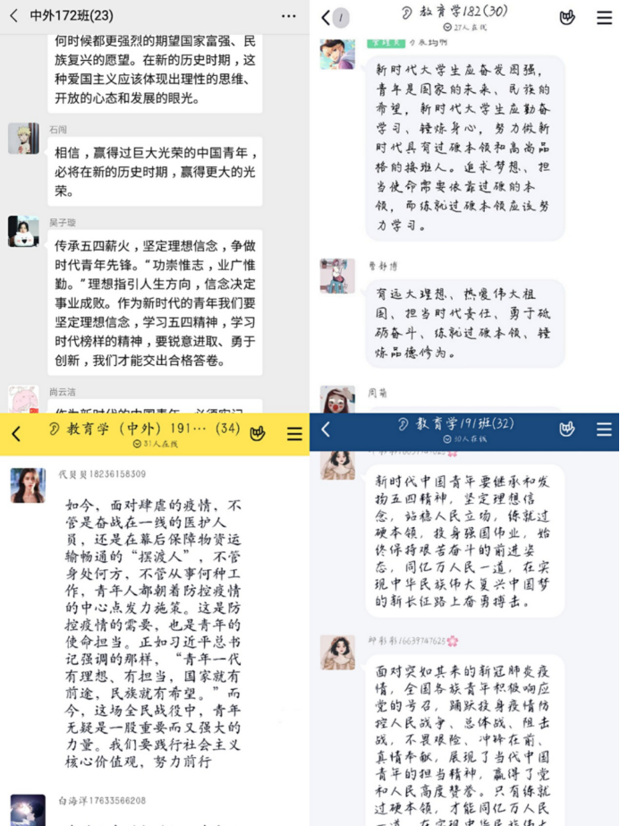 团日活动上,各团支部书记带领本支部团员青年认真学习了习近平总书记五四寄语的核心要义、河南省委书记王国生在全省各界战“疫”优秀青年座谈会上的讲话和贺军科书记对总书记寄语精神的诠释。各团支部学生纷纷表示,作为新时代大学生,定将牢记总书记嘱托,充分发挥青年生力军和突击队的作用,牢记使命担当,练就过硬本领,锤炼品德修为,真正把习近平总书记对新时代青年的寄语精神转化为坚定的信仰信念和行动自觉。