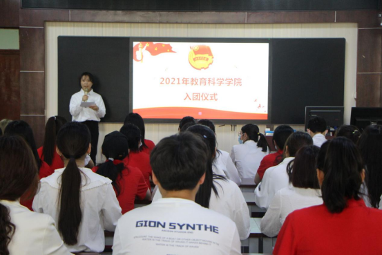在老图书馆四楼教学技能实训室举行2021年入团仪式。2020级团支书、新发展团员及各班团员代表参加会议。会议由学前203班董婕主持。