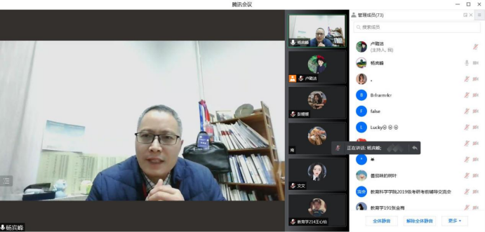 于线上举办了2019级考研经验暨心理辅导交流会。院长杨宾峰、2021级学前教育专业研究生彭媛媛及考研学生参加了交流会。2019级辅导员卢璐洁主持会议。
