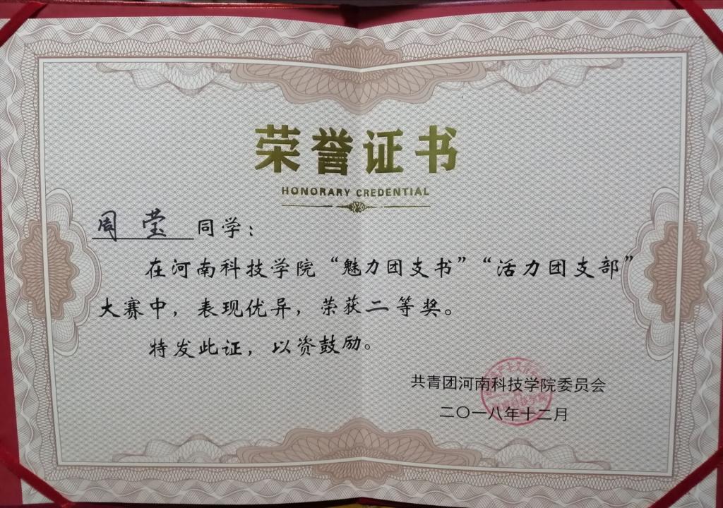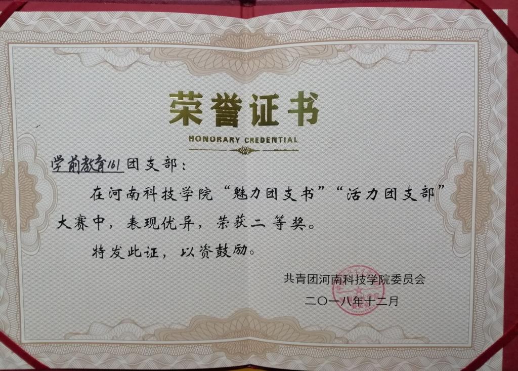 凭借扎实的工作作风、良好的精神风貌以及强烈的服务意识,绅士漫画 学前教育161班学生周莹在16位候选团支书中脱颖而出,荣获“魅力团支书”称号,其所在团支部荣获“活力团支部”称号。
