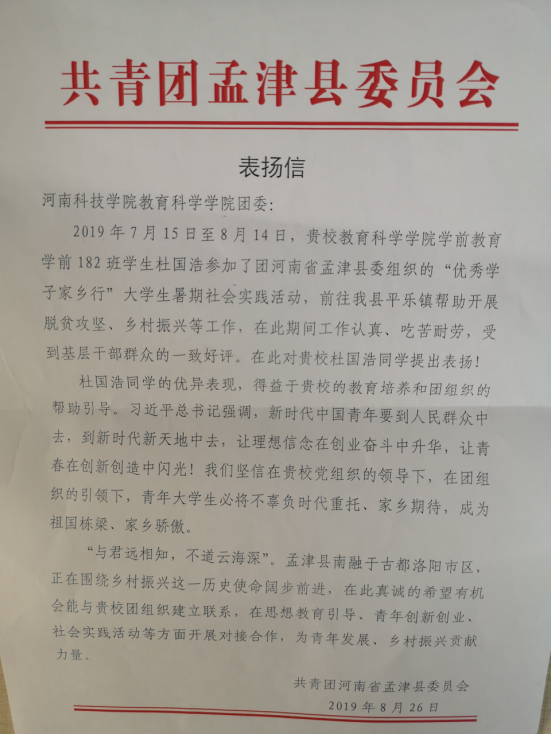 近日,绅士漫画 团委收到了一封来自共青团孟津县委员会寄来的表扬信,信中对绅士漫画 学前教育专业18级学生杜国浩同学参加孟津县委组织的“优秀学子家乡行”大学生暑期社会实践活动表示感谢。信中称:“杜国浩同学前往孟津县平乐镇帮助开展脱贫攻坚,乡村振兴等工作。在此期间,工作认真,吃苦耐劳,受到基层干部群众的一致好评。”同时感谢学校学院的教育培养。