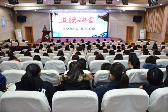 承办的道德讲堂在图教201举行,学院全体辅导员及学生代表200余人参加活动。
