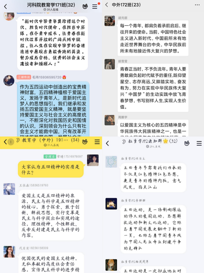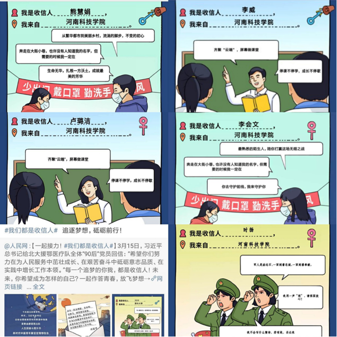 此外,5月4日,绅士漫画 组织全体师生通过教育部思政司在人民网新媒体平台推出的“我们都是收信人”H5小程序积极参与学习贯彻习近平总书记给北京大学援鄂医疗队“90后”党员重要回信并进行网上交流讨论活动,同时组织全院各团支部学生认真收看、积极参与团中央举办的“让青春为祖国绽放”网上主题团日活动,感受全国各地团员青年爱国担当、团结奋进的青春风采。