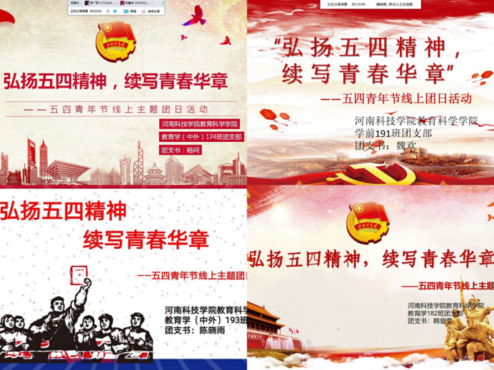 4月26日—28日,组织全院各团支部开展“弘扬五四精神,续写青春华章”线上主题团日活动。团日活动中,各团支部书记带领团员们重温入团誓词,齐唱《中国共产主义青年团团歌》,回顾五四历史,感悟五四精神的内涵与底蕴,向五四运动致敬。同时通过学习疫情防控中涌现出来的90后、00后先进人物事迹,进一步凝聚青春力量。团员们纷纷表示会勇敢肩负起时代赋予的责任和使命,努力在实现中华民族伟大复兴中国梦的生动实践中放飞青春梦想。