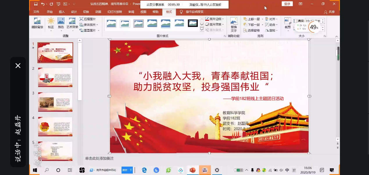 为深入学习贯彻习近平新时代中国特色社会主义思想,切实将思想政治引领元素融入团的各类工作形态,形成全方位育人的良好局面。8月19日,绅士漫画 组织各团支部开展“小我融入大我,青春献给祖国”线上主题团日活动。活动由各团支部书记主持。