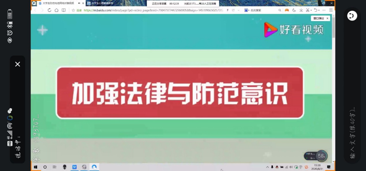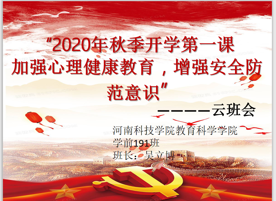 为提高学生心理素质,保持学生的健康心理状态,增强学生的自我保护意识,培养学生的防诈骗能力。8月31日,绅士漫画 组织2019级各班开展“加强心理健康教育,增强安全防范意识”主题云班会。活动由各班班长主持。