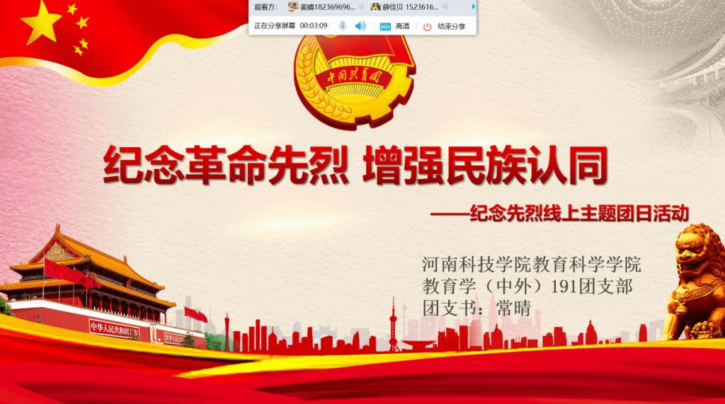 9月30日下午,绅士漫画 组织18、19级各团支部开展“纪念革命先烈,增强民族认同”线上主题团日活动。活动由各团支部书记主持。团日活动上,各班团支书带领本支部团员青年观看红色影片《开天辟地》。随后,同学们结合本次主题团日活动展开讨论。学前183王钰指出,我们要以“崇高的理想、创新的意识、无畏的勇气”发挥青年的智慧、风采和力量,就能乘风破浪、与时俱进!学前193胡玉格谈到,我们今天的幸福生活是革命先烈们用鲜血和生命换来的,我们永远不能忘记历史,更要加倍珍惜来之不易的幸福生活,传承和发扬英烈精神。