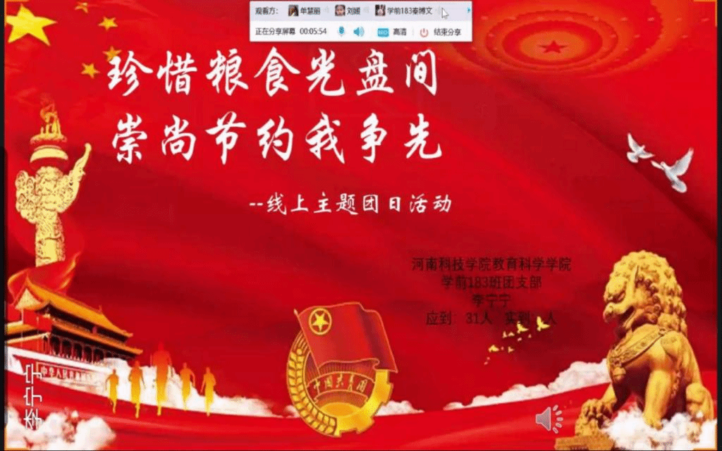 10月6日—10月8日,绅士漫画 组织各团支部开展“珍惜粮食光盘间,崇尚节约我争先”线上主题团日活动。活动由各团支部书记主持。团日活动上,各团支部书记带领本支部团员青年通过共享屏幕的形式观看了“光盘行动微视频”。随后,各团支部学生针对“光盘行动微视频”和团日活动学习内容进行交流。学前教育182班刘薇谈到,一粥一饭当思来之不易,半丝半缕恒念物力维艰。我们既要做“光盘行动”的实践者,也要做“光盘行动”的推动者。教育学(中外)191班王依淼同学提出,我们要树立正确的观念,以节约为荣,浪费为耻,珍惜粮食,适量用餐。