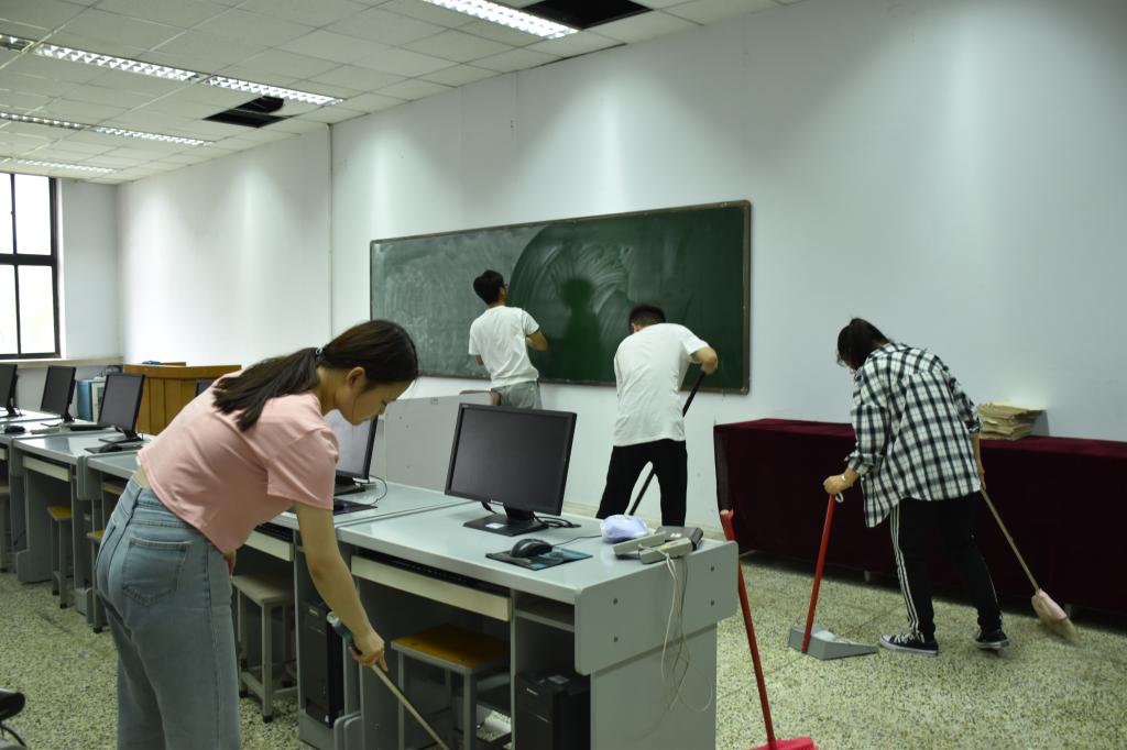 组织志愿者打扫零号楼十楼资料室和心理实验室。