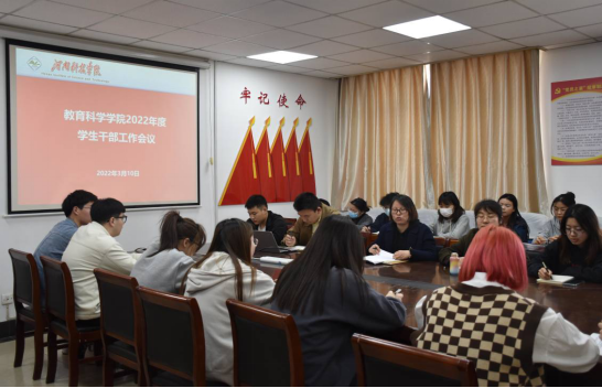 于零号楼十楼会议室召开2022年度学生干部工作会议。团委书记熊慧娟、团委副书记卢璐洁、辅导员王立霖、各年级主要学生干部参加会议。会议由熊慧娟主持。