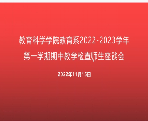 于线上召开2022-2023学年第一学期教育学专业教学期中检查师生座谈会。教科院副院长王晶、教育系主任李红义、教研室主任杨红旻、马燕、于洪姣,任课教师代表董天鹅、李晓以及教育学专业各班学生代表参加座谈会。