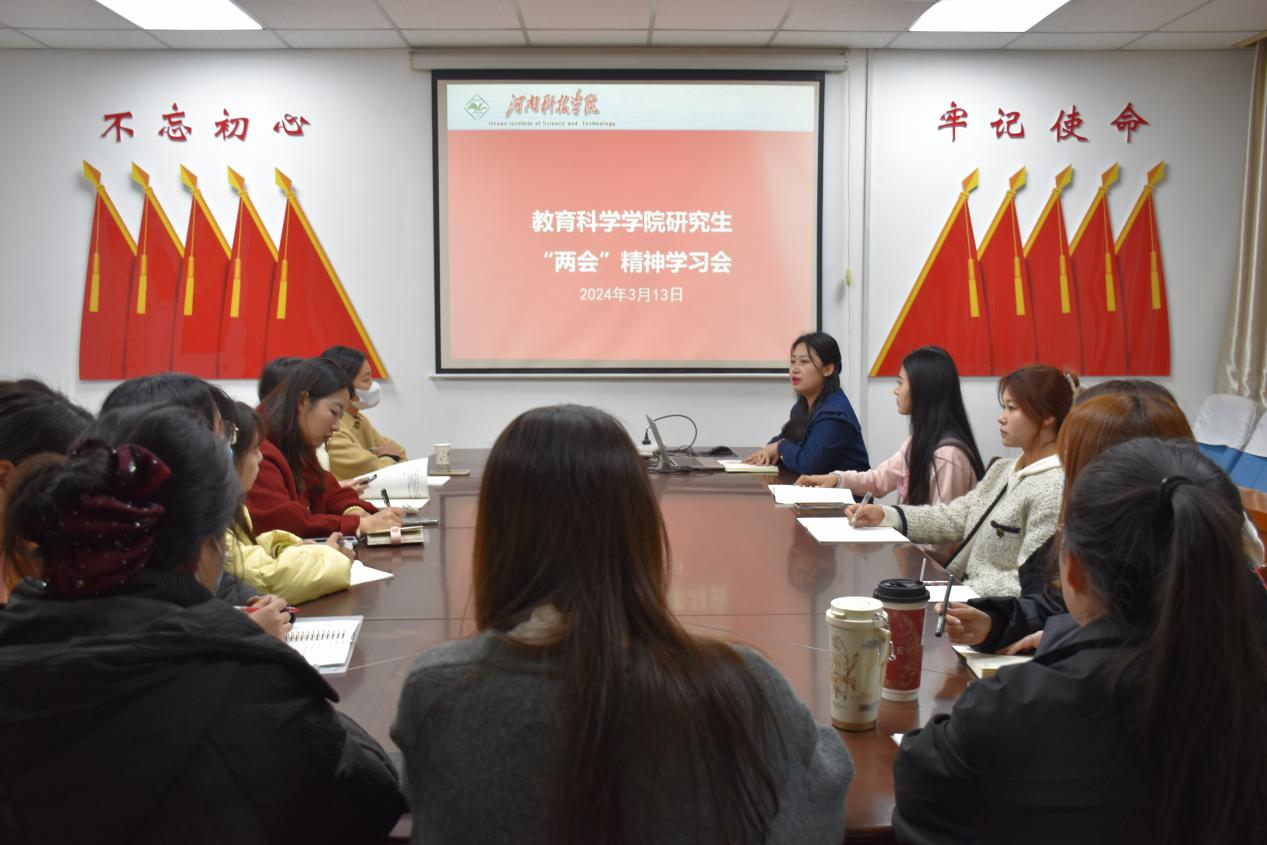 在0号楼1008会议室举行研究生两会精神学习会,研究生辅导员程静、全体2022、2023级研究生参加会议。