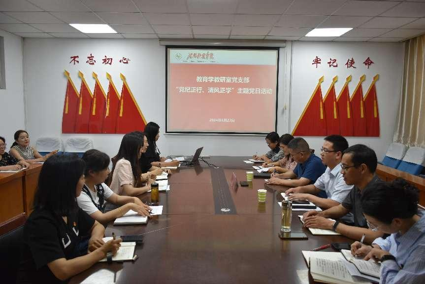 教育学教研室党支部参加主题党日活动。本次党日活动选取“党纪正行,清风正学”为主题,采用集中学习研讨的方式进行。主题党日活动由教育学教研室党支部书记主持。