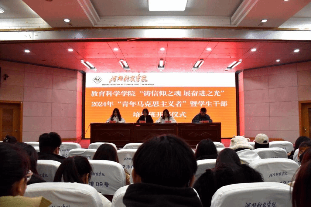 在图教201会议室举办“铸信仰之魂 展奋进之光”2024年“青年马克思主义培养工程”暨学生干部培训班开班仪式。院党委副书记李鹏、团委书记王毓影、正科级辅导员程静、团委副书记王立霖出席会议,2023级、2024级全体班委及团委学生会全体成员100余人参加会议。会议由王立霖主持。