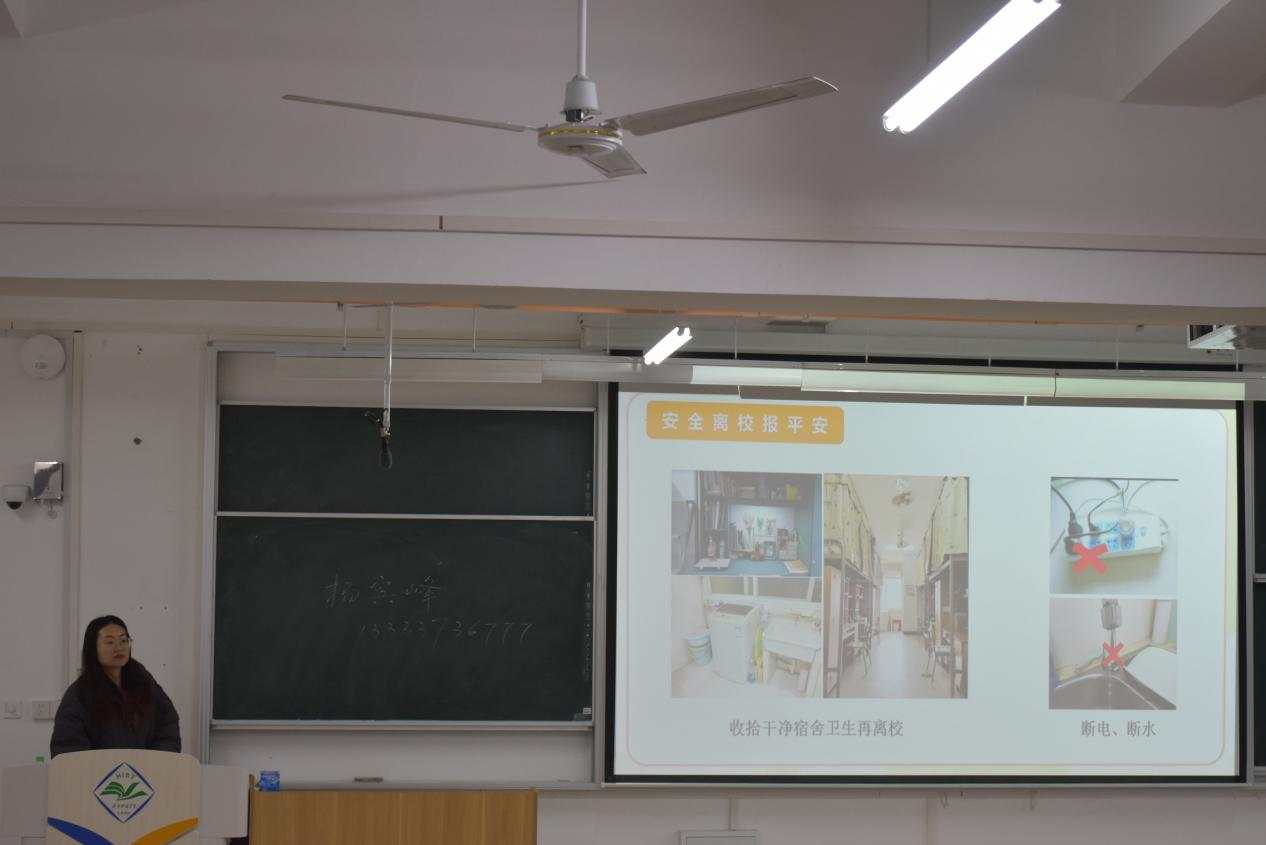 在安全离校环节,王毓影详细讲解离校前的准备工作,包括检查个人物品、关闭宿舍水电等。强调离校途中的安全注意事项,如选择正规交通工具、注意途中财物安全、与家人或朋友保持联系等。此外,还提醒学生们在离校后要保持健康的生活习惯,不参与任何违纪违法活动。