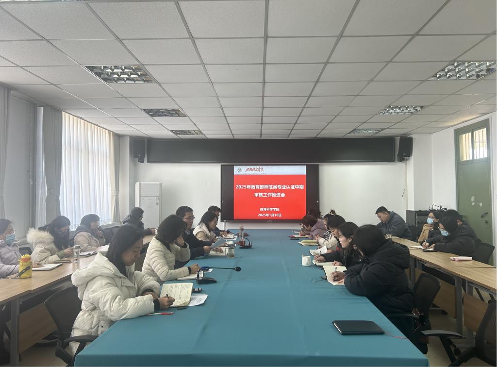 在0号楼906会议室召开2025年教育部师范类专业认证中期审核工作推进会。学院领导班子、全体教师参加会议。会议由院长李小丽主持。