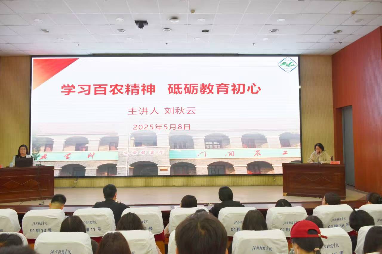 在图书馆一楼报告厅举办“学习百农精神 砥砺教育初心”专题讲座。学院全体教师和学生代表共280余人参加活动。活动由学院党委副书记李鹏主持,学院副院长刘秋云主讲。