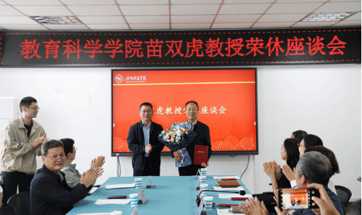 党委副书记李鹏介绍苗双虎基本情况,宣读荣休通知;胡铁柱为苗双虎颁发荣休证书和纪念品;青年教师向苗双虎献花。与会人员分享与苗双虎相处的点点滴滴,言语中充满敬重与不舍。苗双虎发表荣休感言,表达对大家的感谢,以及对学校的深深眷恋与殷切期望。