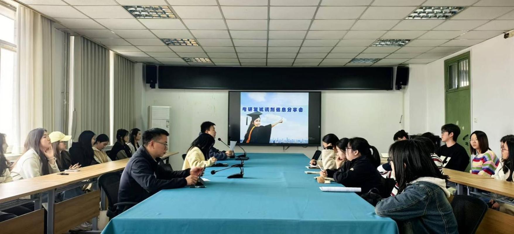 在零号楼906会议室举行2026届本科毕业生考研调剂指导会,研究生秘书李会文、辅导员王立霖及2026届考研学生参加会议。