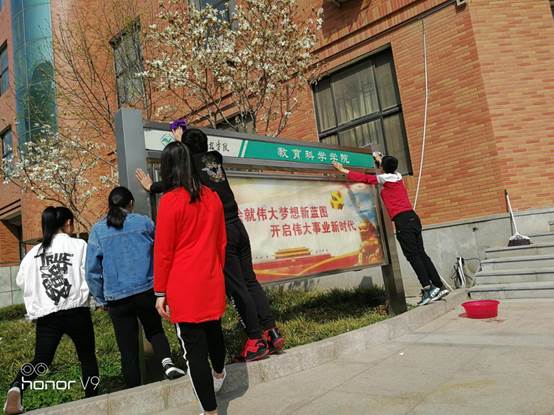 3月25日下午,志愿者们以“践行雷锋精神”为主旨,开展了清洁校园活动。志愿者们自带扫帚、拖把、毛巾等工具,擦拭教学楼旁的宣传栏,捡拾草坪内的垃圾,在实践中切实体验雷锋精神。