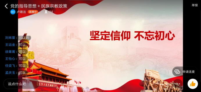 院团委副书记卢璐洁结合疫情防控工作中涌现出的先进典型事迹讲解了《党的指导思想》《中国特色社会主义民族宗教知识理论》,鼓励学员们向先进典型学习,坚定理想信念,提高党性修养,充分践行当代青年使命担当。
