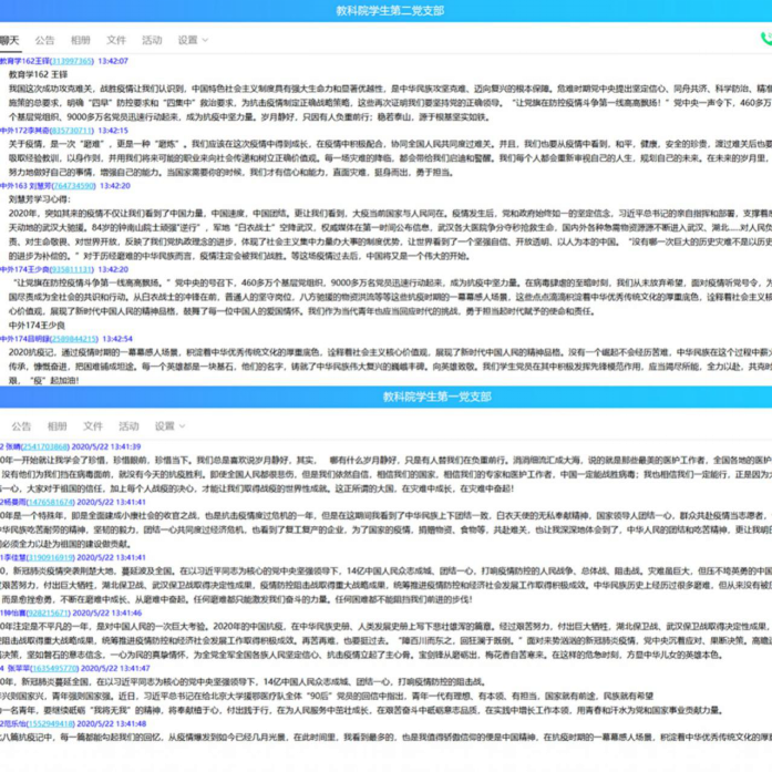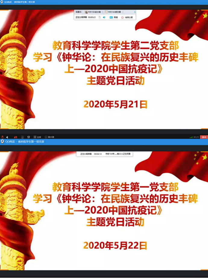 学生第一、第二党支部组织开展学习《钟华论:在民族复兴的历史丰碑上——2020中国抗疫记》线上主题党日活动。活动由各学生党支部书记主持,学生党支部全体成员参加。