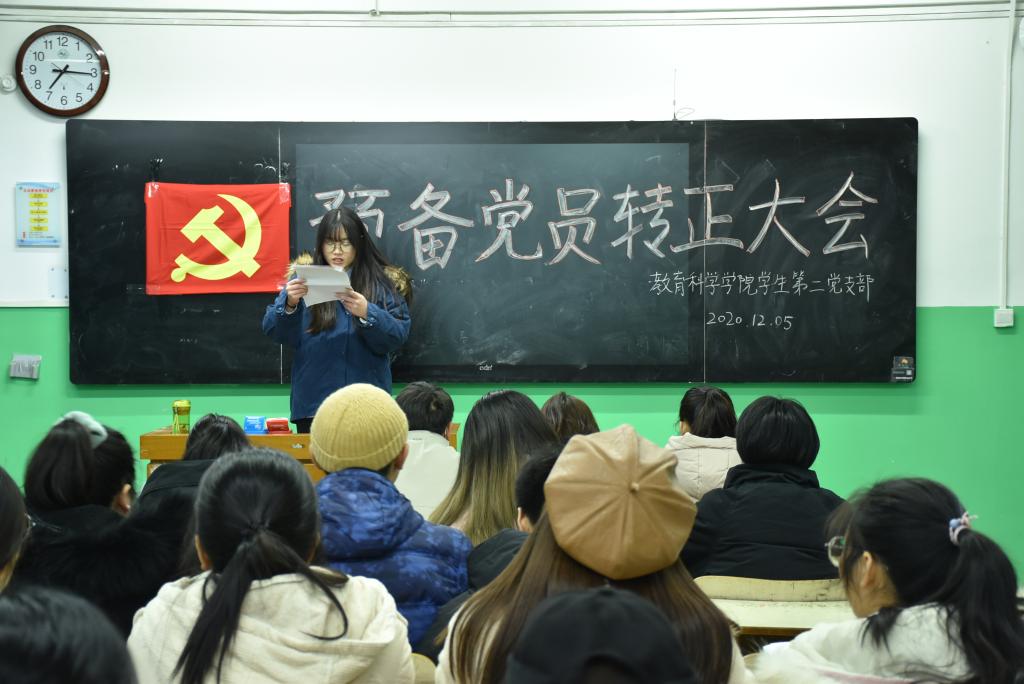大会在国歌声中开始,会议严格按照中共党员转正的程序进行。首先申请转正的预备党员依次上台宣读转正申请书,就预备考察期间的思想、学习、生活、工作等方面进行剖析,并表明自己对转正的态度和今后的决心;入党介绍人介绍预备党员的相关情况,并对其能否按期转正发表了意见。与会党员结合几位同志的汇报以及在日常生活、学习中的实际表现,就大家的转正申请进行讨论、评议。经过无记名投票表决,最终同意郭红梅、窦卯可等14名同志按期转正,成为中共正式党员。