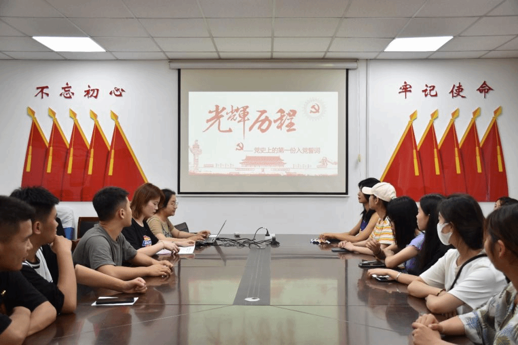 学生第一党支部书记卢璐洁于零号楼十楼会议室做题为《辉煌历程—党史上第一份入党誓词》专题党课,学生第一党支部全体党员到场聆听学习。