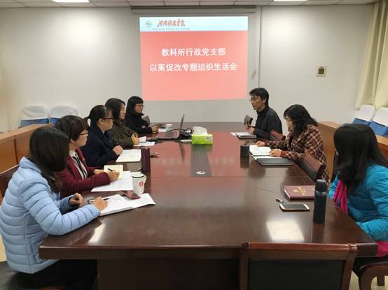 2018年11月12日下午,教科所行政党支部在0#楼10楼会议室召开“以案促改”专题组织生活会。支部成员于洪姣、熊慧娟、崔丽娟、李晓、张倩倩、卢璐洁参加会议,学院党委副书记王鲁伟以普通党员身份参加会议。会议由党支部书记周启主持。