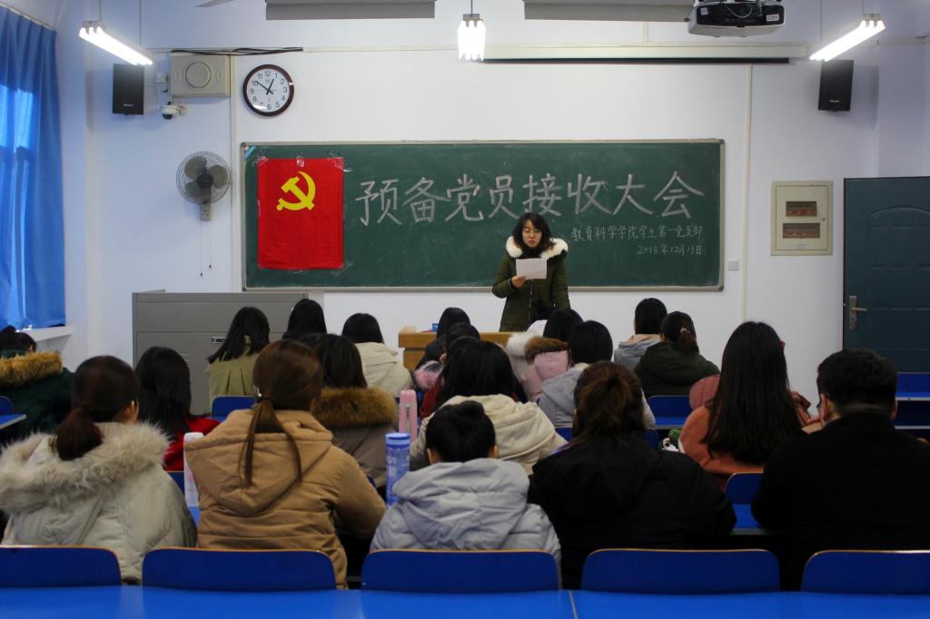 学生第一党支部在9203教室召开预备党员接收大会。学生第一党支部书记卢璐洁主持会议。支部全体党员、预备党员参加会议。