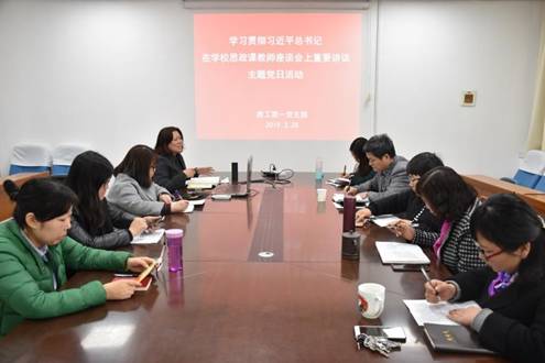 教工第一党支部全体党员教师在0#楼会议室举行了“学习贯彻习近平总书记在学校思政课教师座谈会上重要讲话”主题党日活动。支部书记郭庆霞主持会议。院党委书记张涛、副院长周启以普通党员身份参加。